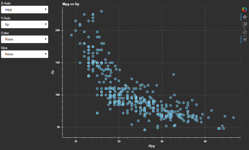 bokeh 는 이러한 시각화를 도와주는 파이썬 라이브러리다. 파이썬을 사용하는 많은 사람들이 matplotlib 를 알고 있을 것이다. 거의 모든 분야에서 시각화 예제는 이 matplotlib 로 구현되어있기 때문이다. matlab 과 비슷하고, 편리하기도 하다. 하지만 단점으로는 반응형으로 만들기 어렵다는것과 무엇보다도 그닥 이쁘지 않다는 것이다. 나는 더 비주얼적으로 임팩트가 있는 툴을 찾다가 bokeh 를 찾게 되었다. 우선 시선을 사로잡는 세련된 디자인과, 다양한 기능이 있는 반응형이라는 것이 마음에 들었다. 무엇보다 jupyter 와 완벽히 호환된다는 것이 가장 매력적이다.